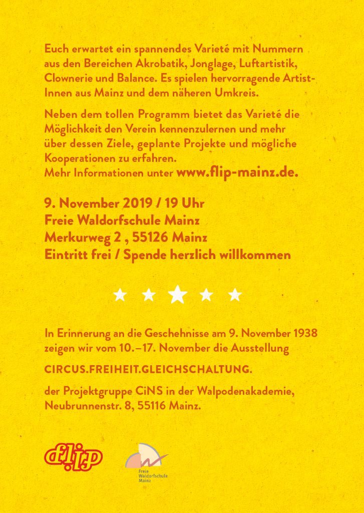 Save the Date! Das 4. flip Varieté wird am Samstag den 7.11.2020 14.11.2020 um 19 Uhr in der Freien Waldorfschule Mainz Finthen statt finden! Freut euch jetzt schon mit uns auf neue sowie bekannte Künstler*innen !